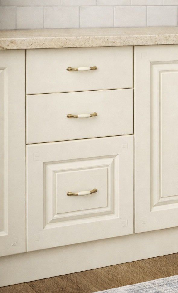 Daca spatiul tau se rezuma la 260 x (90x60 colt) x 260 cm si esti un iubitor al culorii crem, noi iti recomandam mobila de bucatarie Roma Colt 2!