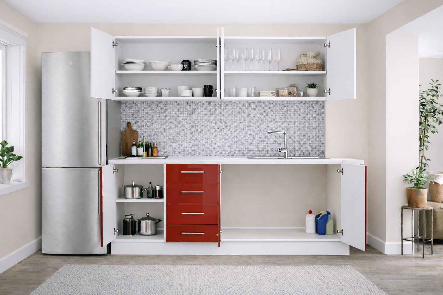 Transformă-ți locuința cu o bucătărie din MDF lucioasa, perfectă pentru un decor modern și luminos. Finisajul lucios oferă un aspect premium, mărește vizual spațiul și se curăță rapid, fiind ideal pentru utilizare zilnică. Mobilierul este rezistent, practic și bine compartimentat, pentru o organizare eficientă a tuturor ustensilelor.